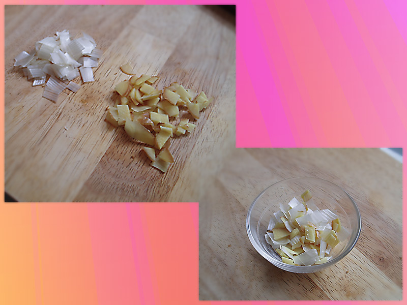 1、スライスした生姜を小さい四角に切る。